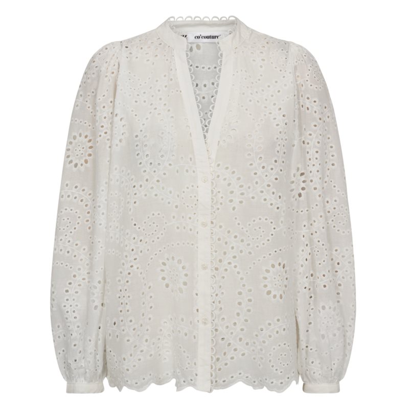 Denna eleganta blus i broderie anglaise kombinerar romantiska detaljer med modern stil. Tillverkad i mjukt och lätt bomullstyg, blusen har en V-ringad krage med vacker brodering och en rad knappar framtill för en klassisk finish.