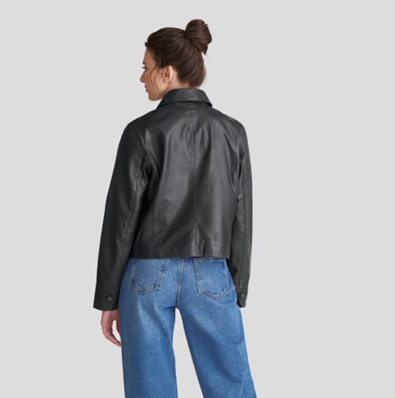 Avslappnad men elegant skinnjacka. Enkla detaljer som skjortkrage och diskreta midjefickor. Kortare längd och knäppning framtill ger jackan en modern touch. Bär den istället för en kavaj med jeans eller en feminin klänning.