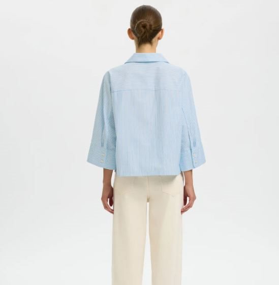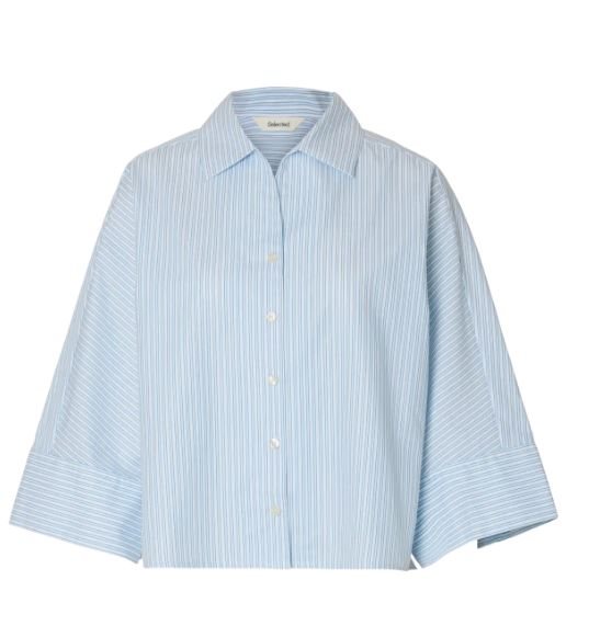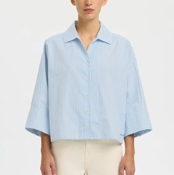 Denna eleganta skjorta kombinerar en klassisk design med moderna detaljer. Den har en stilren skjortkrage och knäppning framtill som ger ett tidlöst och sofistikerat uttryck. De vida 3/4-ärmarna skapar en feminin silhuett och ger ett luftigt, bekvämt fall.