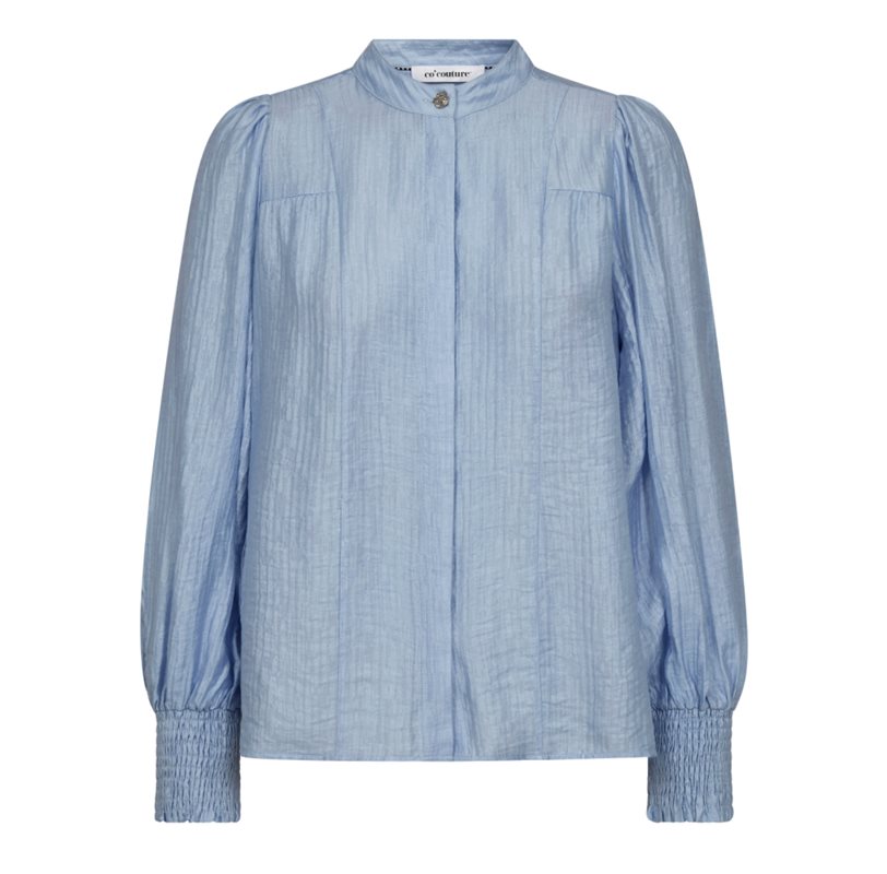 Elegant och luftig ljusblå skjorta med lätta ballongärmar som avslutas med smockdetalj vid handlederna för en mjuk och feminin silhuett. Skjortan har dold knappstängning framtill och en romantisk knapp vid halsen som tillför en fin detalj. Det lätta, luftiga materialet gör den bekväm att bära både till vardags och fest, samtidigt som den ger ett stilrent och sofistikerat intryck.