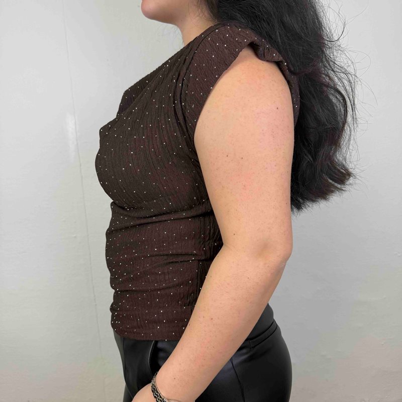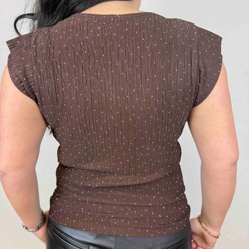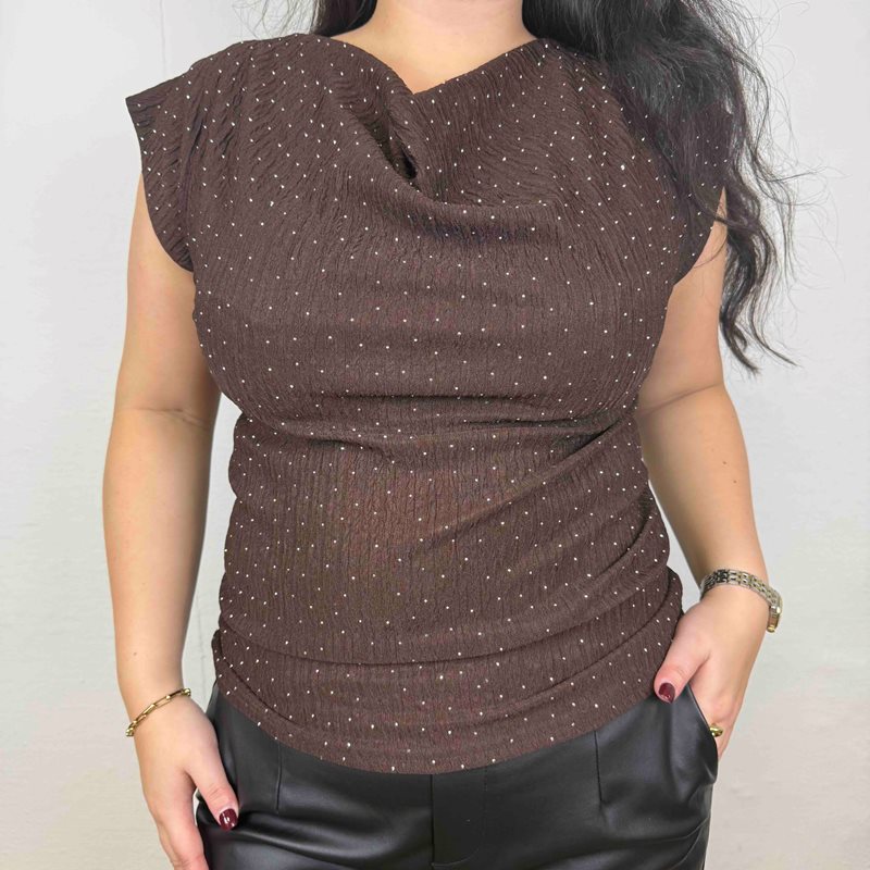 En unik topp i plisserat tyg med små glittrande stenar över hela som fångar ljuset på ett vackert sätt. Toppen har holkärm och en vacker vattenfallskrage som ramar in halsen mjukt och feminint.