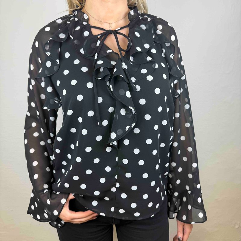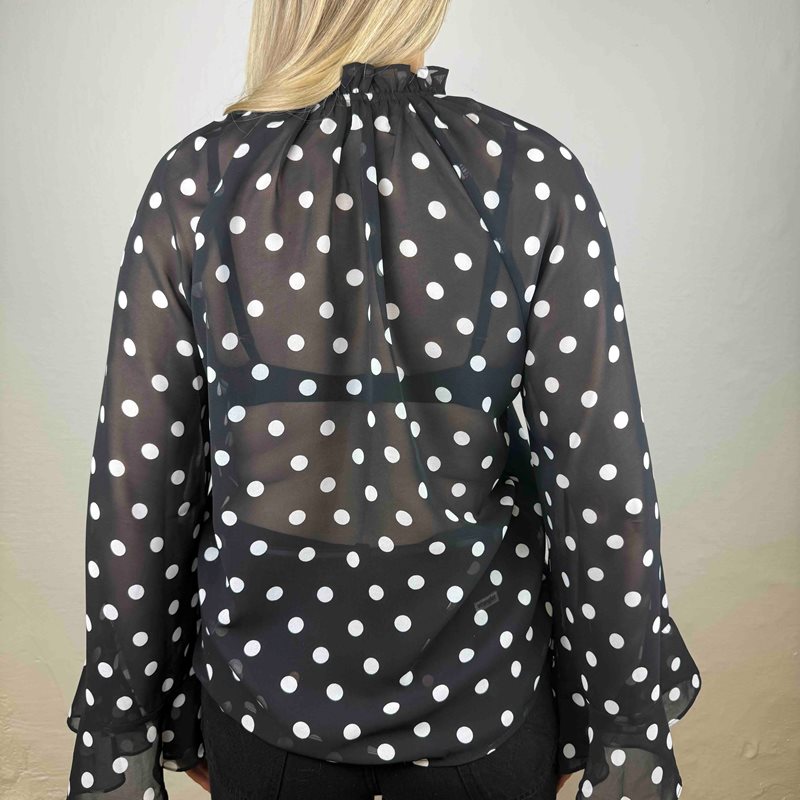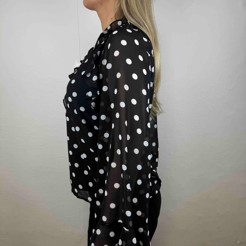 En romantisk och stilren prickig blus med vackra detaljer som lyfter din vardags- eller festlook. Blusen har en volangkrage och ett knytband vid halsen som du kan lämna öppet för en avslappnad stil eller knyta till en söt rosett för en mer elegant touch.