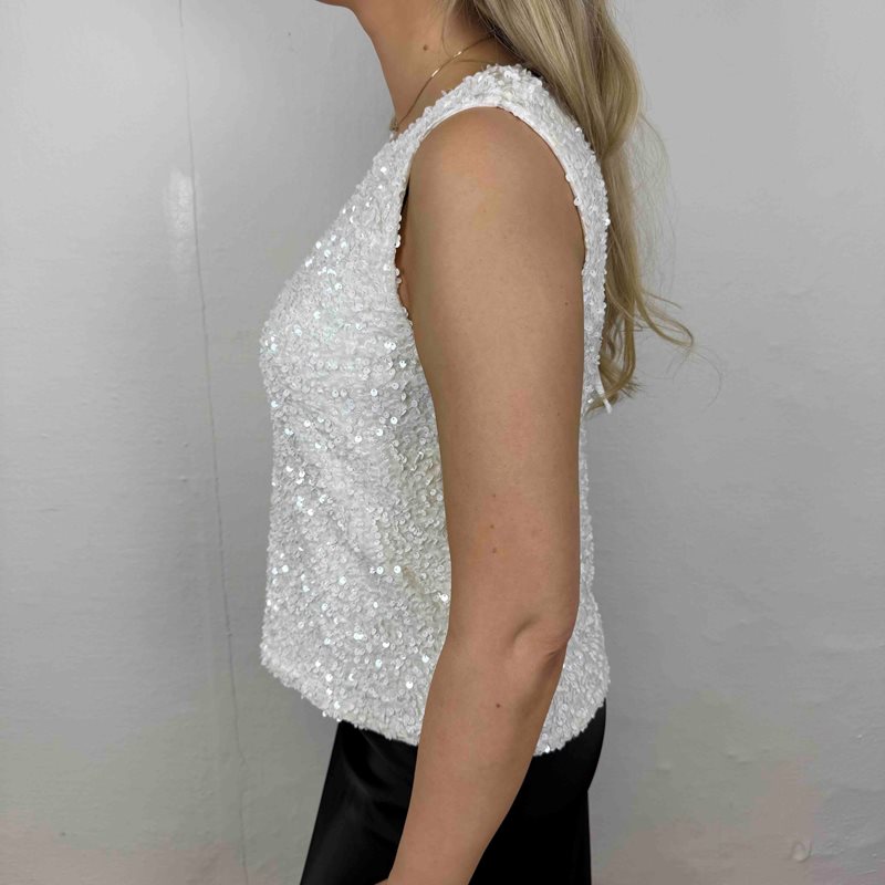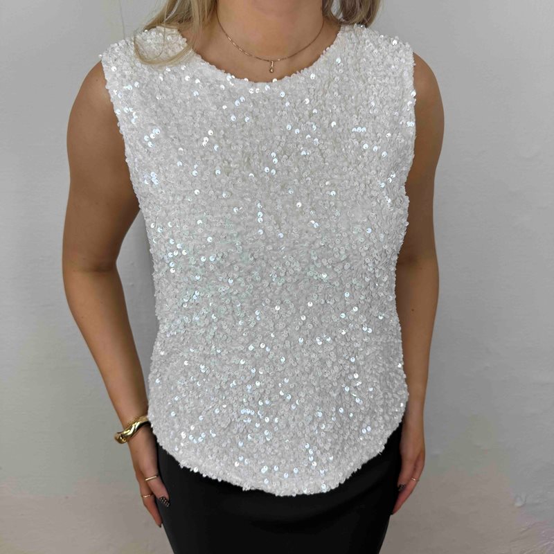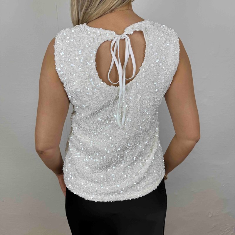 Låt outfiten glittra i denna vackra paljettopp med ärmlös design och en nyckelhålsöppning i nacken som knyts med ett sött snöre i rosett. Den perfekta toppen för fest, middag eller andra speciella tillfällen där du vill glänsa lite extra.