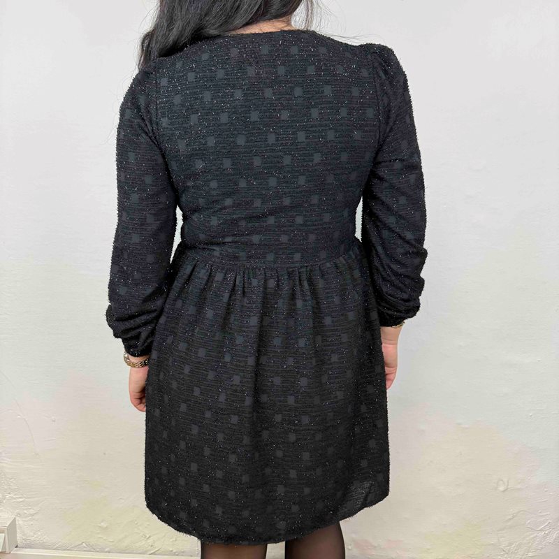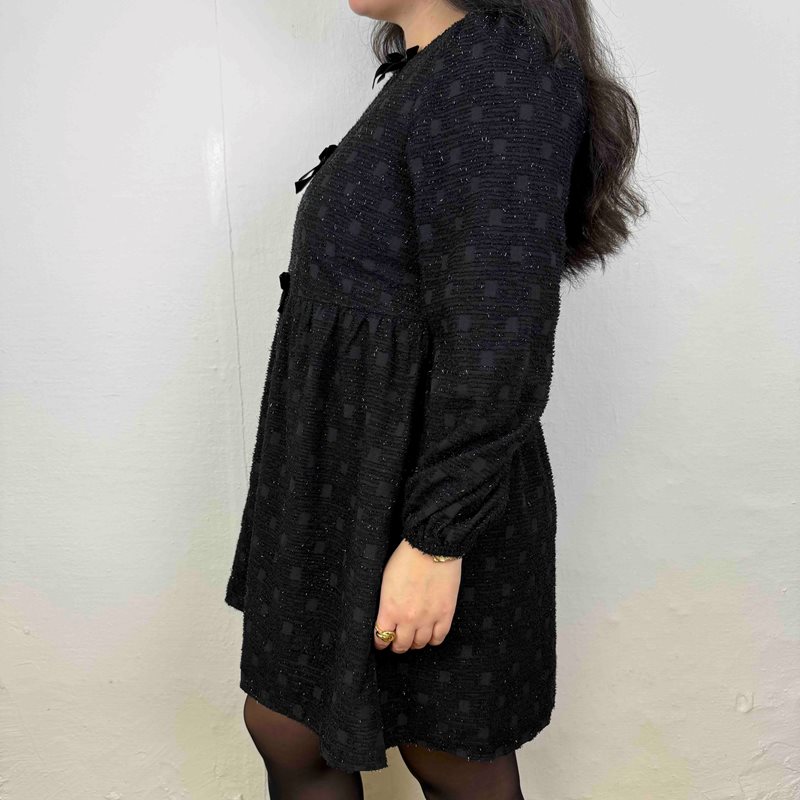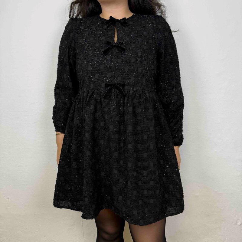 En romantisk och elegant kort klänning med peplum-design som framhäver midjan och skapar en feminin silhuett. Klänningen är dekorerad med svarta sammetsrosetter som ger en vacker kontrast mot det skimrande tyget med små kvadratiska strukturmönster.