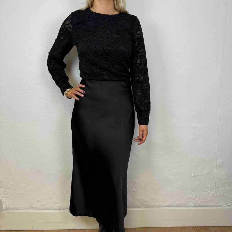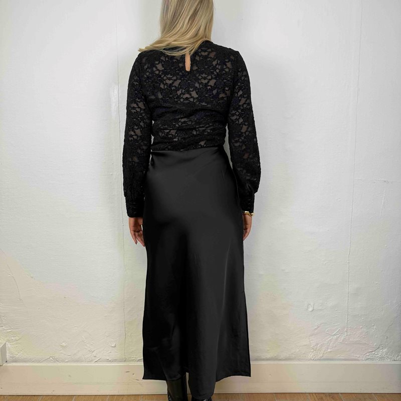 Den blanka satinbotten faller snyggt och skapar en feminin och smickrande silhuett. Perfekt för bröllop, fest, högtider eller andra tillfällen när du vill känna dig extra uppklädd.