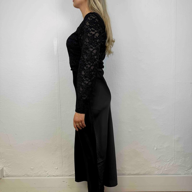 En elegant och sofistikerad klänning som kombinerar en vacker spetsöverdel med en satinliknande kjoldel, vilket ger intrycket av att du bär ett stilrent set med topp och kjol. Den perfekta balansen mellan romantiskt och lyxigt.