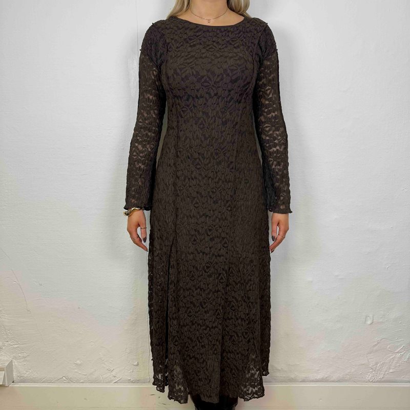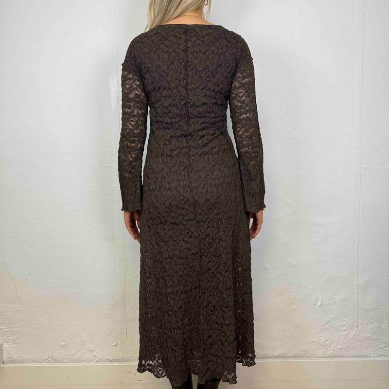 En elegant långärmad spetsklänning med blommigt mönster och vackra synliga sömmar som löper över byst, rygg, ärmar och ner längs klänningen. Dessa sömdetaljer ger plagget en exklusiv och formande effekt som lyfter hela designen.
