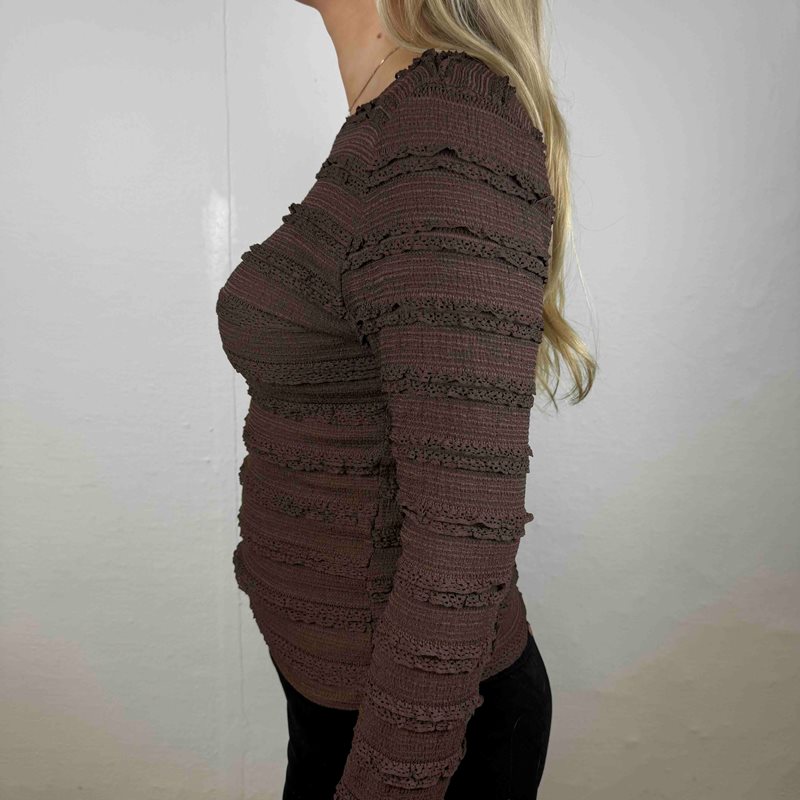 En elegant långärmad tröja i vacker randspets med stretch, som kombinerar komfort och stil. Det mjuka och följsamma materialet ger en smickrande passform samtidigt som spetsstrukturen skapar en feminin och sofistikerad look.