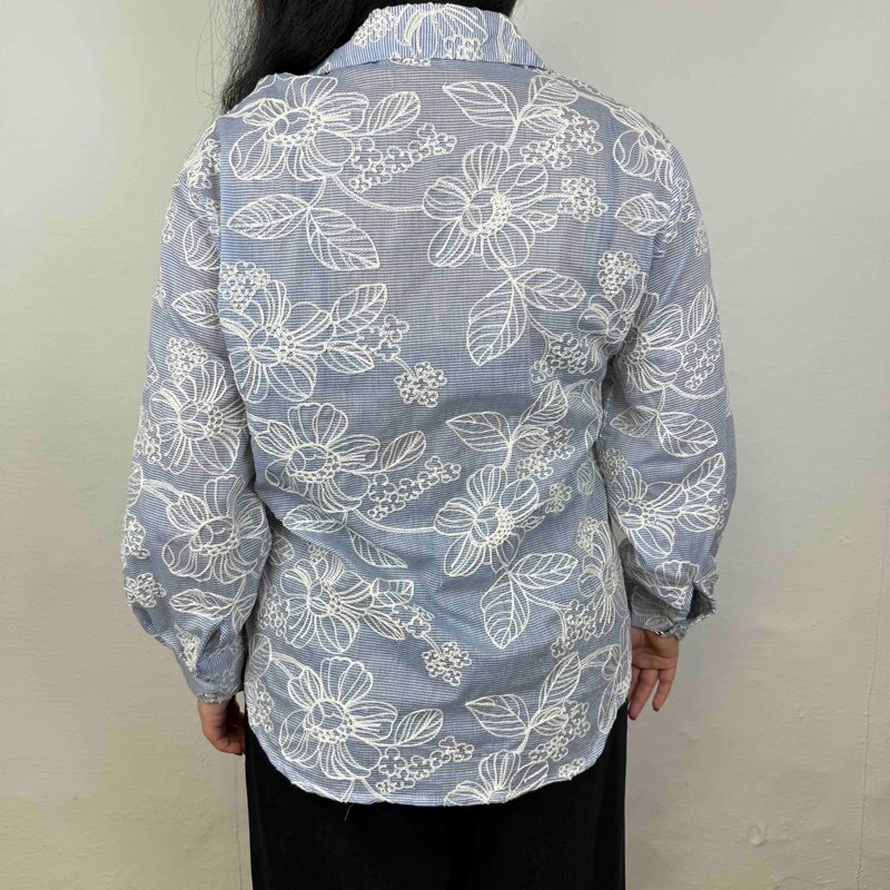En elegant blå skjorta med klassisk krage och synliga knappar i samma material för en enhetlig och stilren look. Skjortan är vackert broderad med vita, sydda blommor som ger plagget en exklusiv och romantisk känsla utan att bli för mycket.