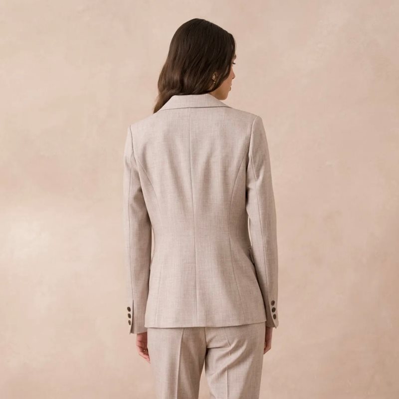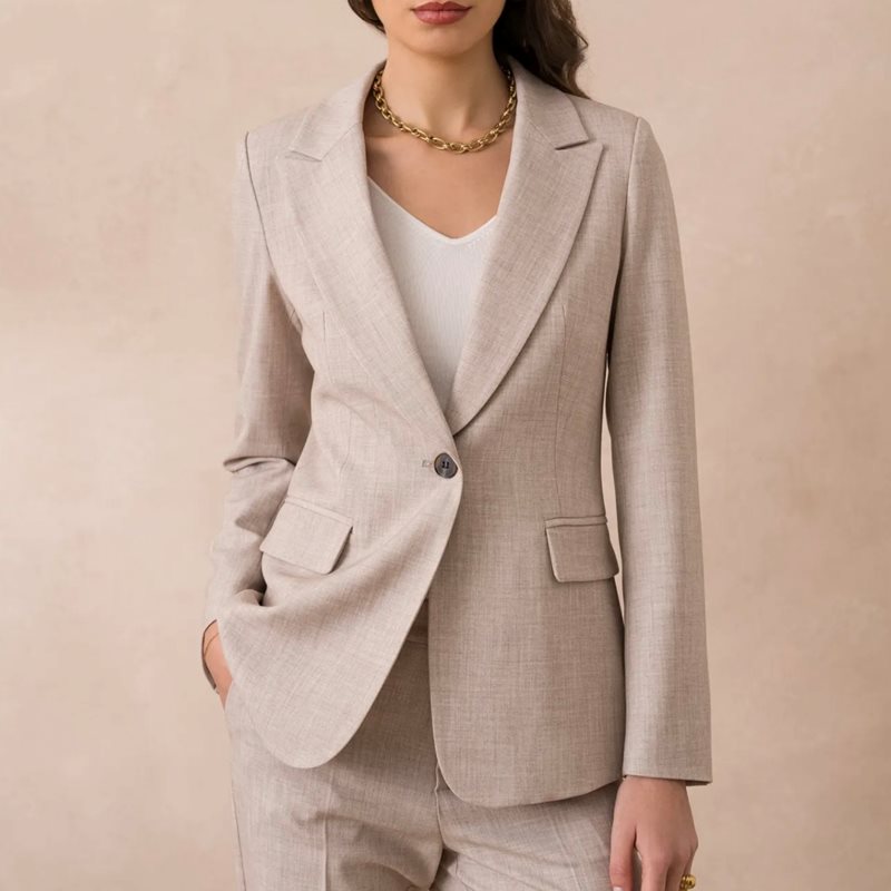 Klassisk kavaj dam i melerad beige med enkelknäppning och tidlös design. Den stilrena passformen gör kavajen perfekt för både arbete och mer uppklädda tillfällen. Matcha med byxorna 32041M-BEGIE för en elegant och komplett kostymlook