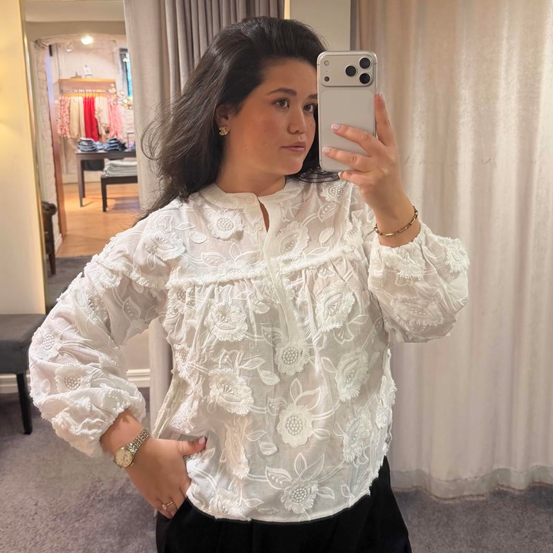 Blus dam med 3D-broderad blomma som ger ett iögonfallande och trendigt uttryck. Modellen har rund halsringning och puffärmar som skapar en feminin och modern silhuett. En statement-blus som passar perfekt till både vardag och fest.
