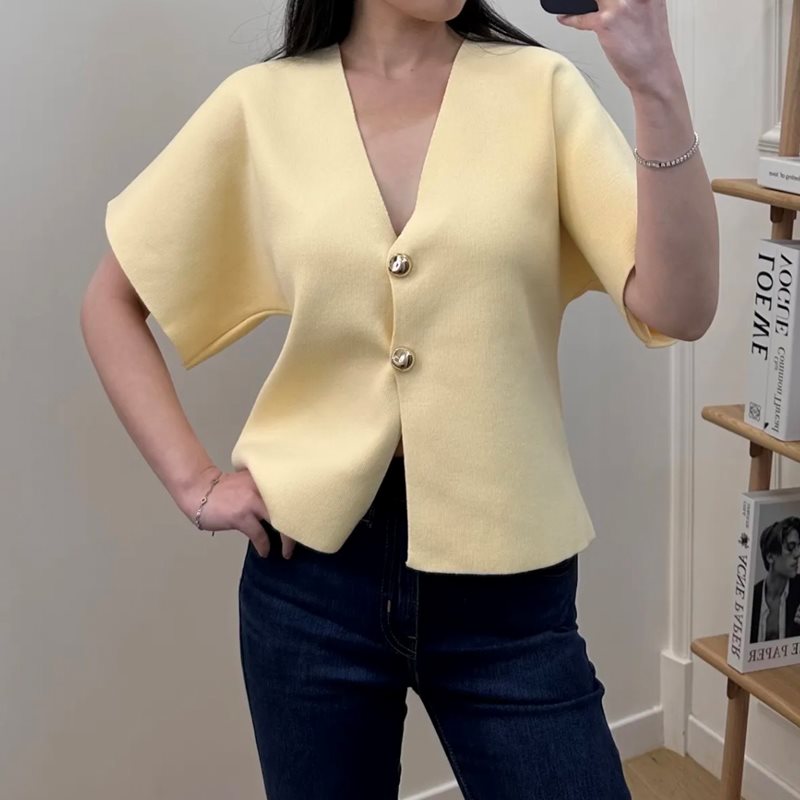 Stickad kortärmad kofta med guldknappar är ett elegant och mångsidigt plagg som passar lika bra till fest som till vardags. Den stilrena designen med två dekorativa guldknappar ger ett sofistikerat uttryck, medan det stickade materialet skapar en mjuk och behaglig känsla.