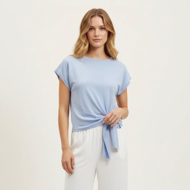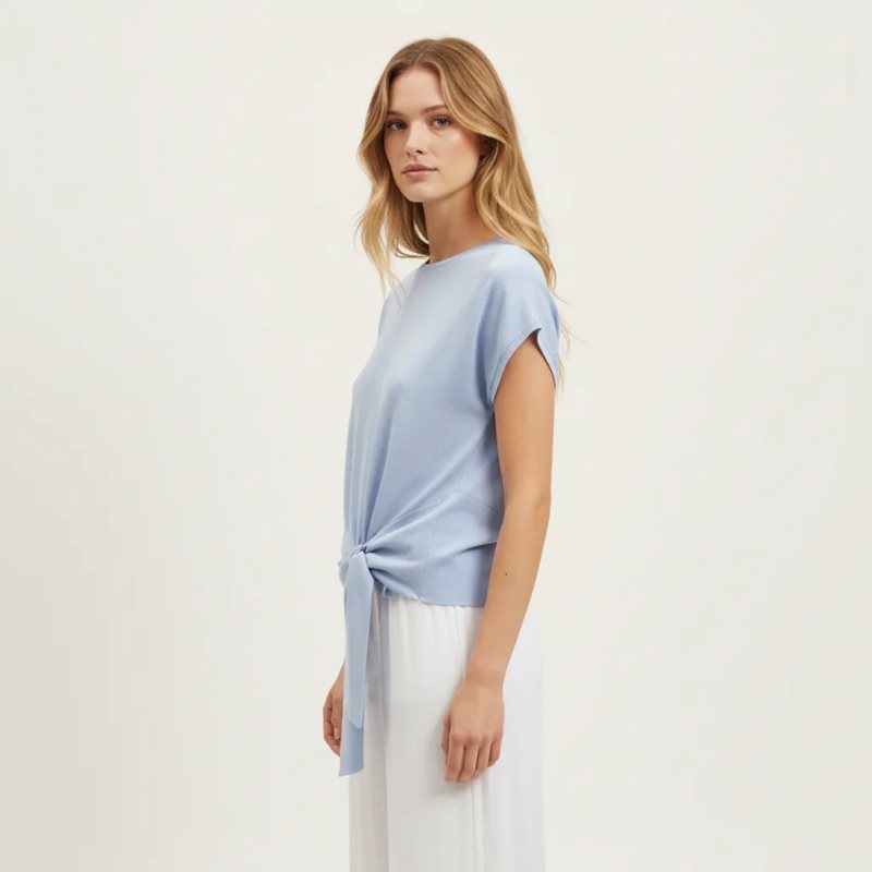 Tunnstickad kortärmad tröja dam med justerbar knytdetalj som gör att du enkelt kan dra åt och anpassa passformen. Tröjan är supermjuk och bekväm, perfekt att bära både till vardags och vid middagar eller mer uppklädda tillfällen.
