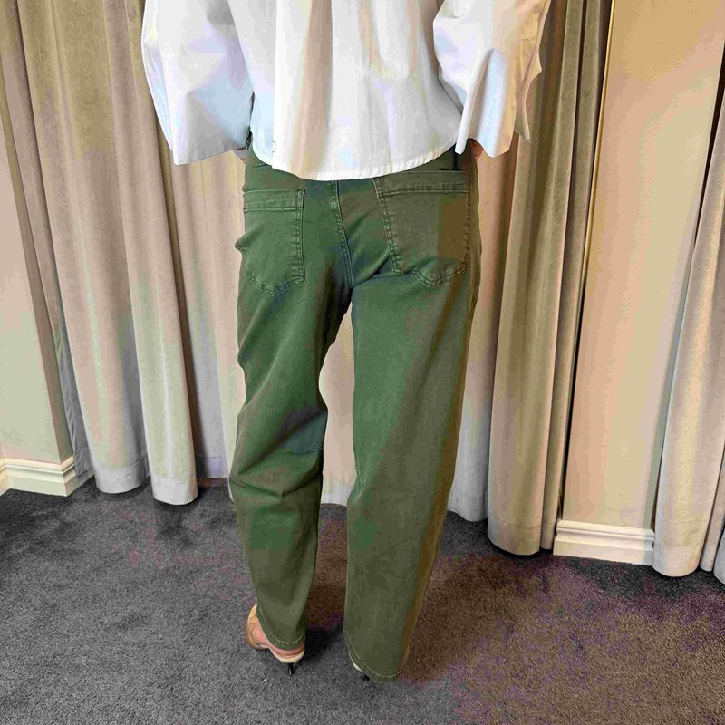 Jeans i en modern barrel-modell med lätt rundad silhuett och midwaist-passform. Den gröna färgen ger ett uppdaterat uttryck, samtidigt som de är bekväma och enkla att styla till både stickat, skjorta eller t-shirt.