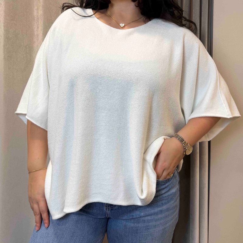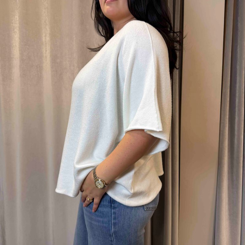 Stickad tröja med rund hals och vid, kort ärm. Modellen på bilden bär normalt storlek Medium, men tröjan är rymlig och passar även upp till storlek XL, beroende på hur man vill att passformen ska vara. Den har en fantastisk kvalitet och kan bäras både som den är eller tillsammans med en snygg blus eller skjorta under.