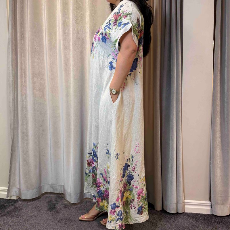 Maxi Klänning i 100% Linne – Blommig med Fickor