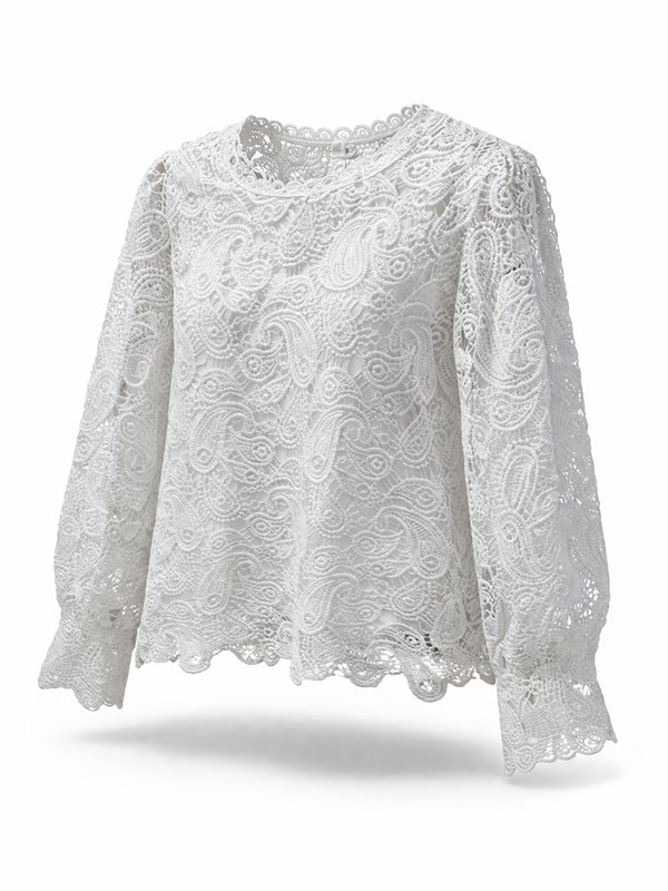 Denna eleganta spetsblus i vitt utstrålar en tidlös och romantisk känsla. Det detaljrika mönstret i paisley- och blominspirerade former skapar ett exklusivt uttryck, samtidigt som den transparenta spetsen ger plagget ett lätt och luftigt fall.