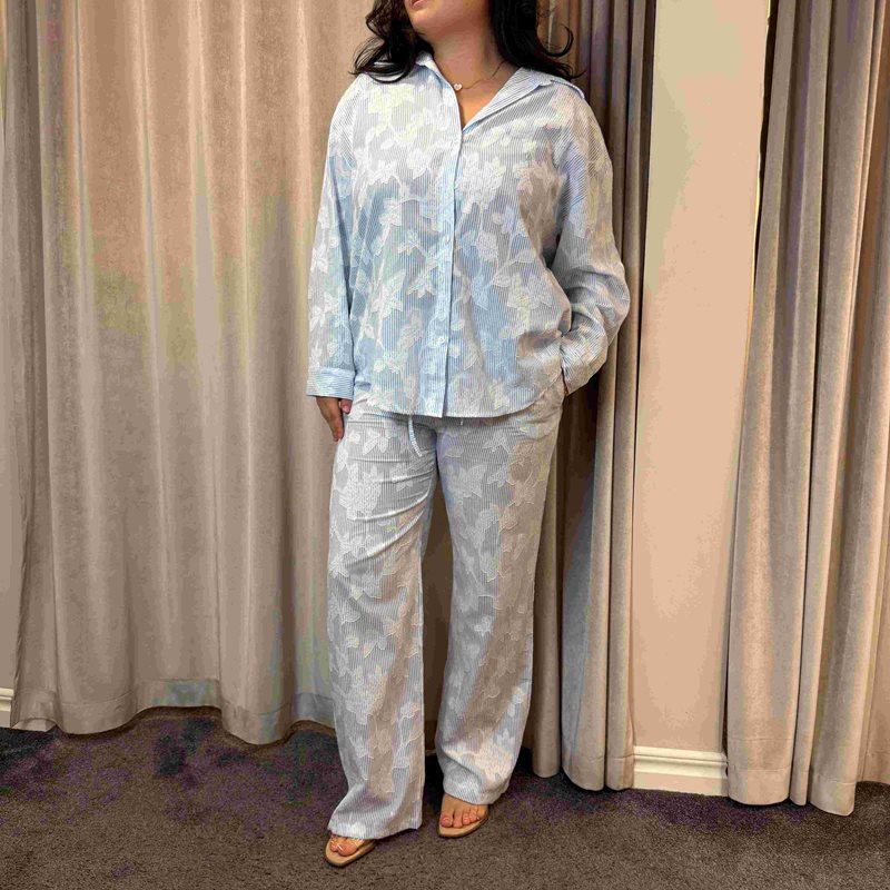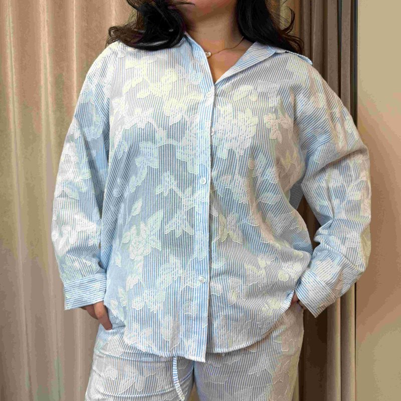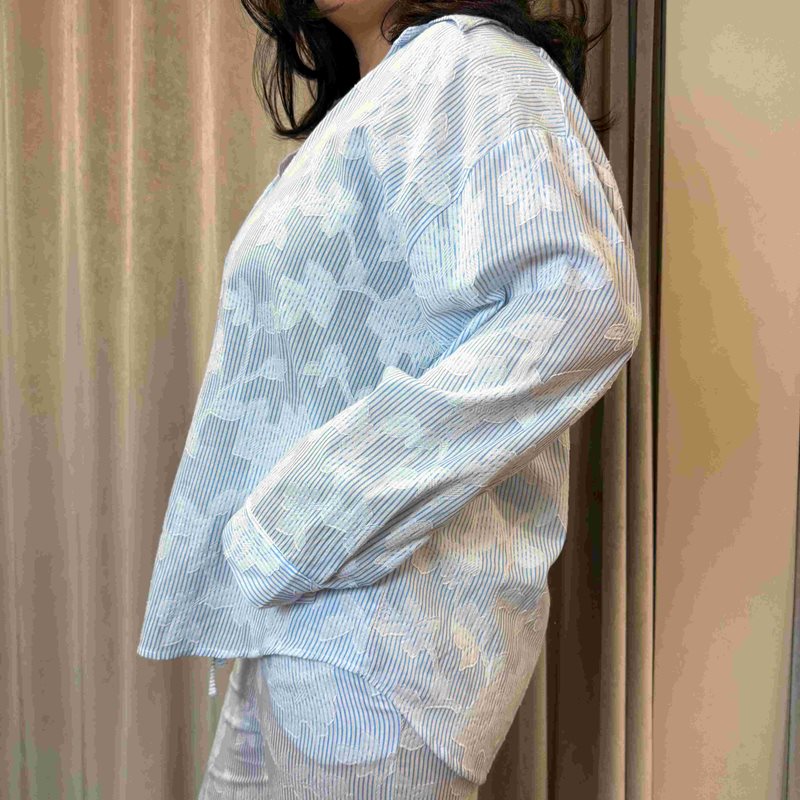 Lätt skjorta med blå ränder och blommigt mönster. Klassisk krage och avslappnad passform som gör den enkel att bära både till vardag och mer uppklätt.