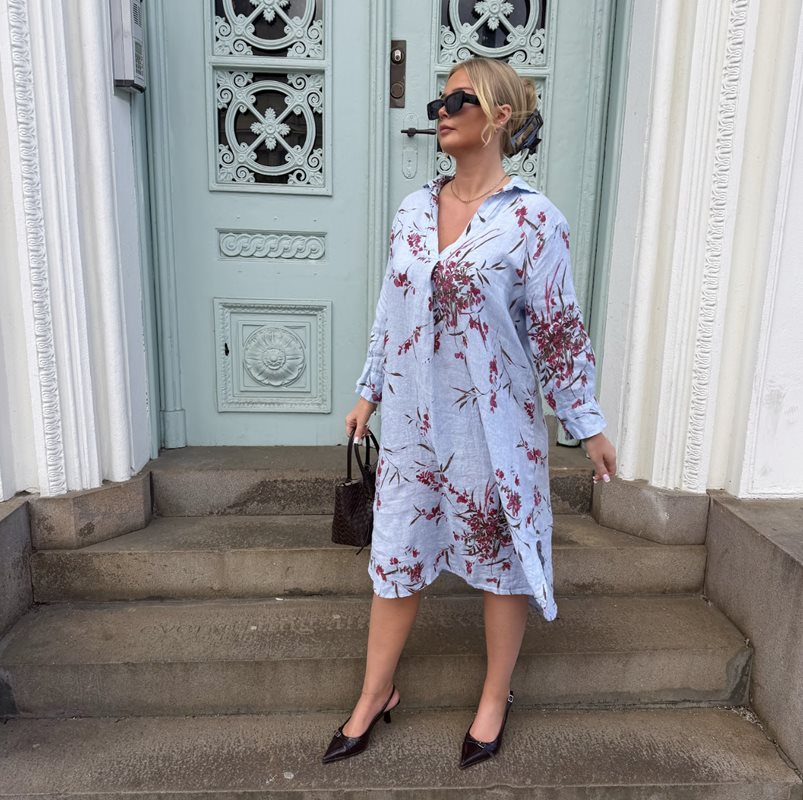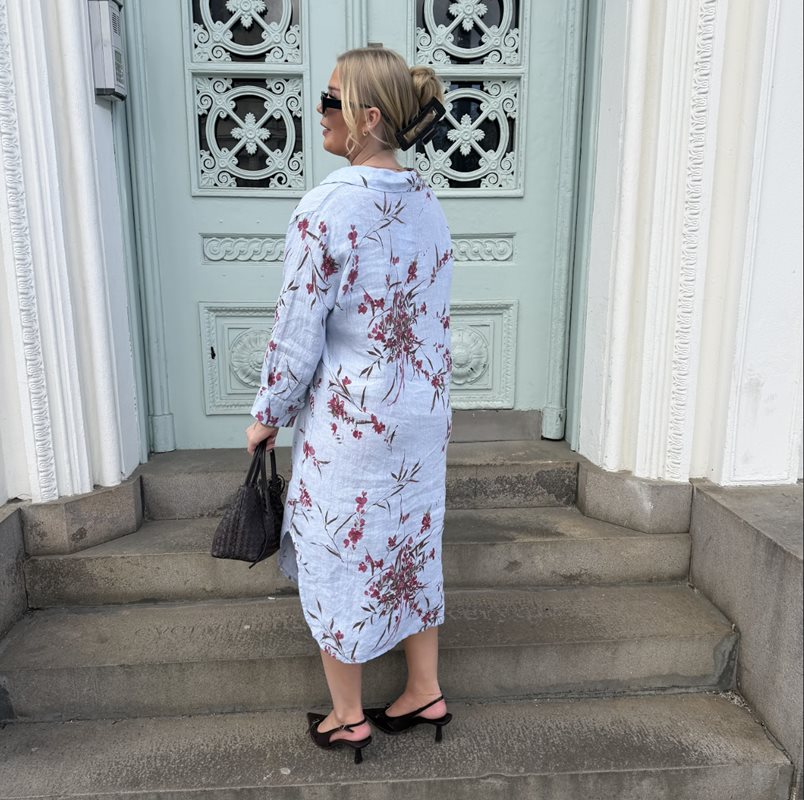 Den här midiklänningen i linne med kvistmönster är ett luftigt och stilrent plagg som kombinerar naturlig komfort med ett subtilt, organiskt uttryck. Det dekorativa kvistmönstret ger klänningen en lugn och harmonisk känsla, inspirerad av naturens former, vilket skapar en tidlös och sofistikerad look.