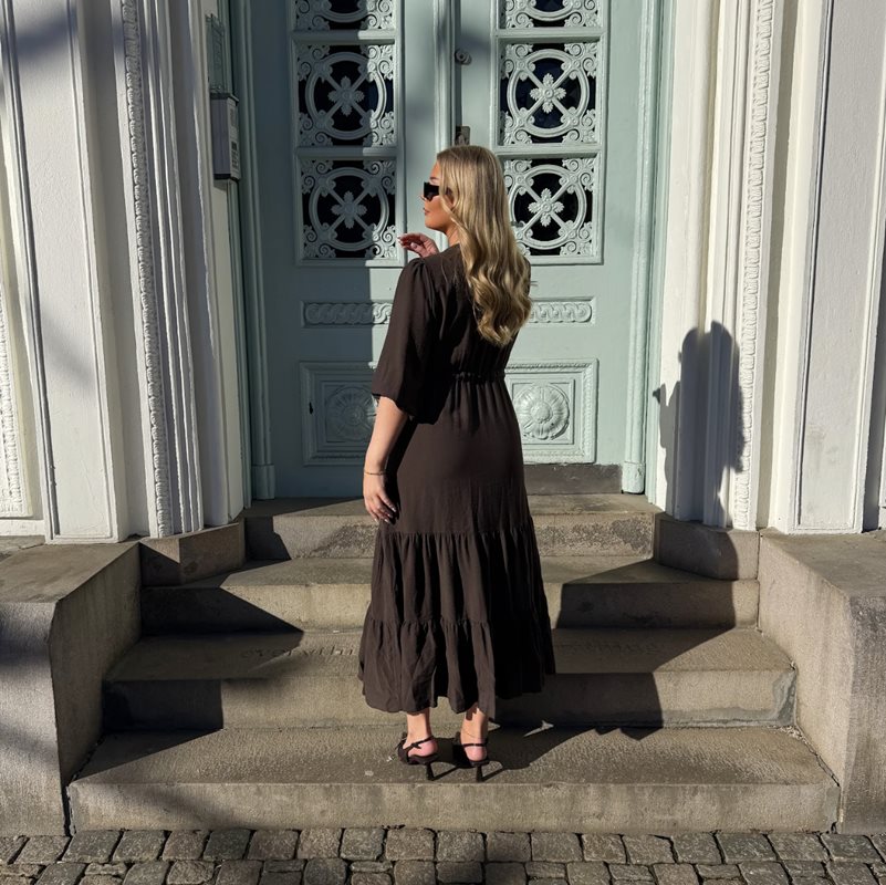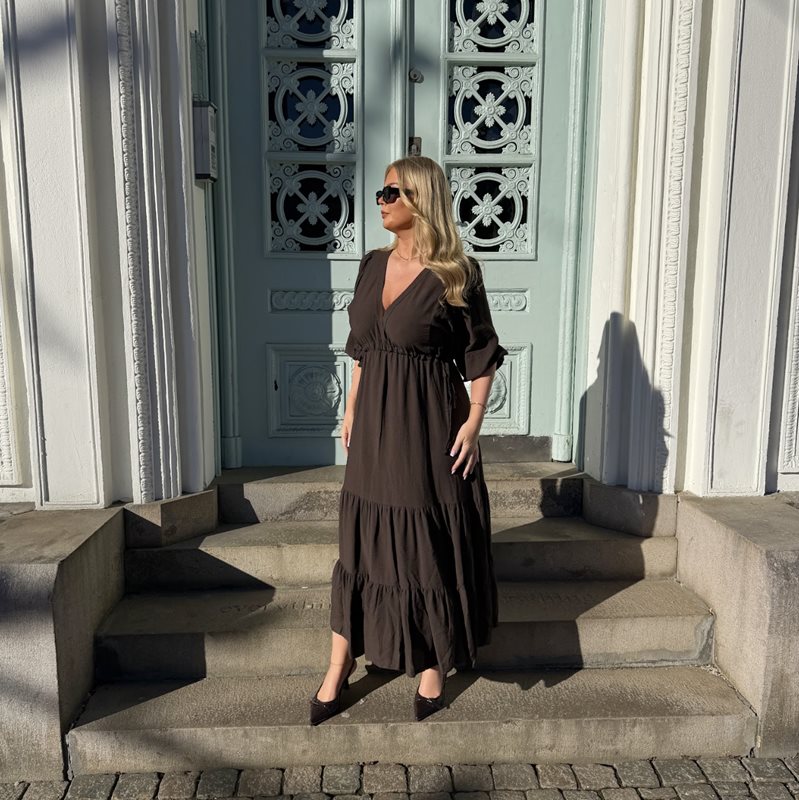 En luftig och somrig maxiklänning med knytdetaljer i midjan som framhäver figuren på ett naturligt och avslappnat sätt. Den är tillverkad i en lätt och sval kvalitet som rör sig mjukt i vinden och ger en härlig känsla under varma dagar. Den långa silhuetten skapar ett elegant uttryck, samtidigt som den känns bekväm och ledig.