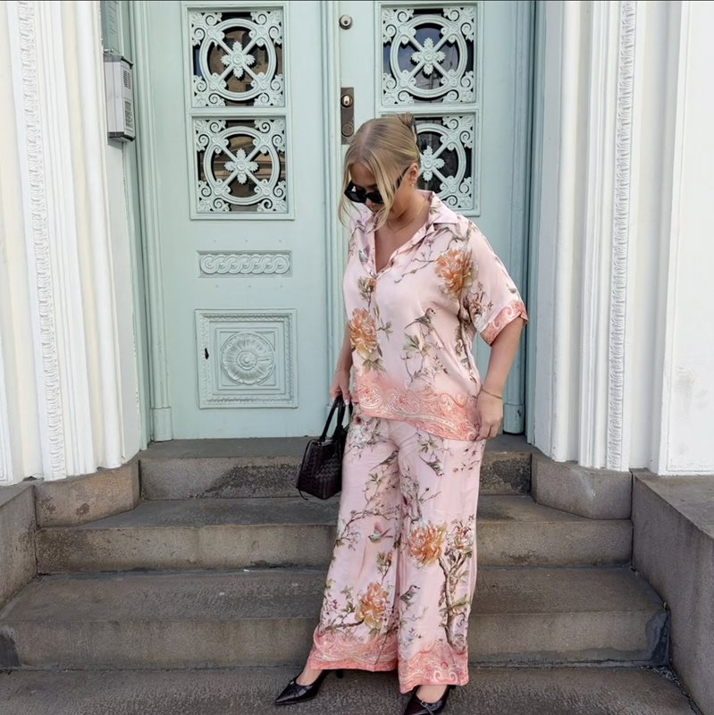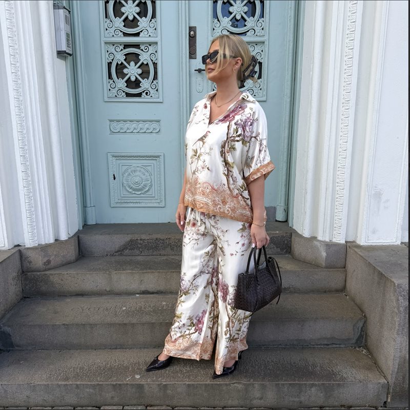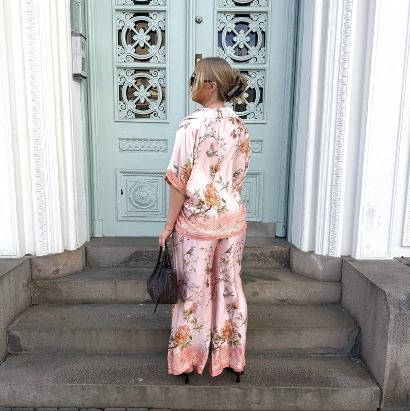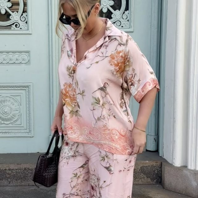 Den här lösa skjortan med fågelmönster är ett uttrycksfullt plagg som kombinerar komfort med en stilren, konstnärlig känsla. Skjortan har en avslappnad passform som faller mjukt över kroppen och ger en luftig silhuett, perfekt för både vardag och mer uppklädda tillfällen. Perfekt att styla med matchande byxor!