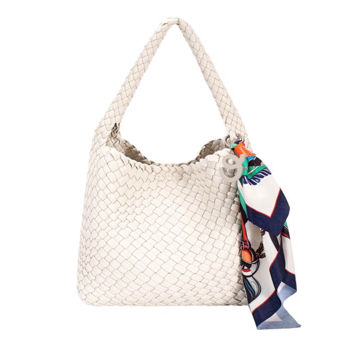 Flätad bucketväska med dekorativa scarves som ger en lekfull och trendig touch. En stilfull accessoar som lyfter både vardags- och sommarlooks, perfekt att bära till klänning, jeans eller strandoutfit.