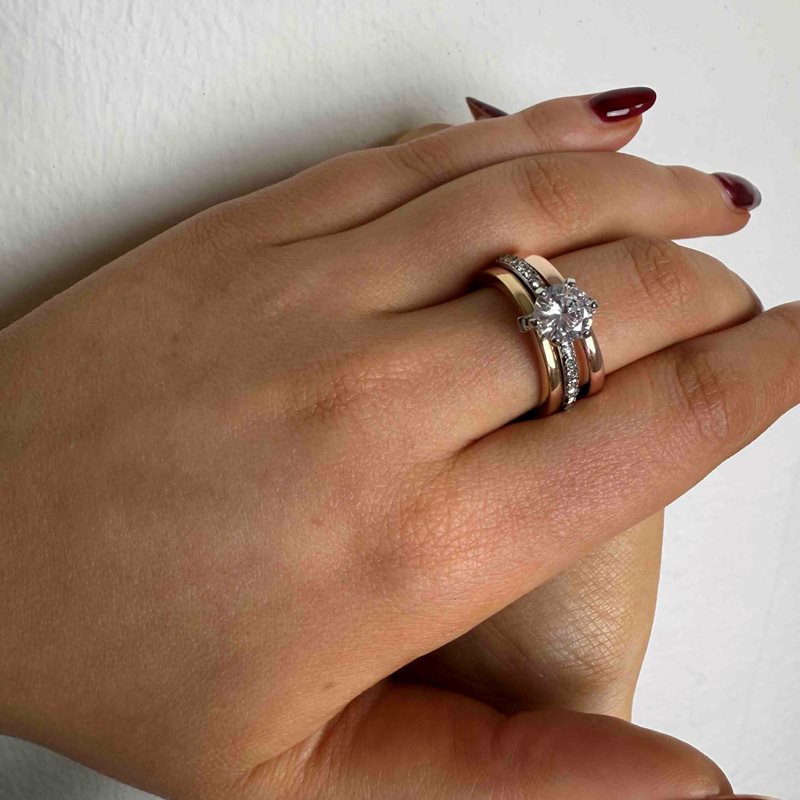Designen ger illusionen av tre separata ringar, med detaljer i roséfärg på vardera sida, vilket skapar ett iögonfallande och trendigt uttryck – men i själva verket är det en enda ring. Ringen är justerbar, vilket gör det enkelt att anpassa storleken genom att trycka ihop eller dra isär för perfekt passform.