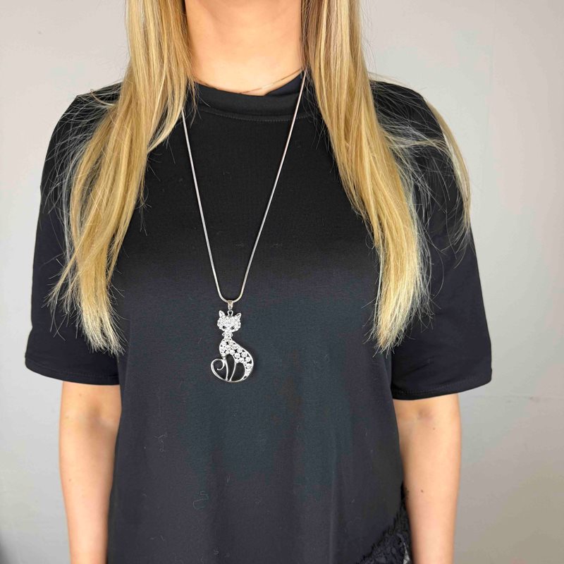 Långt silverfärgat halsband med strassprydd katt