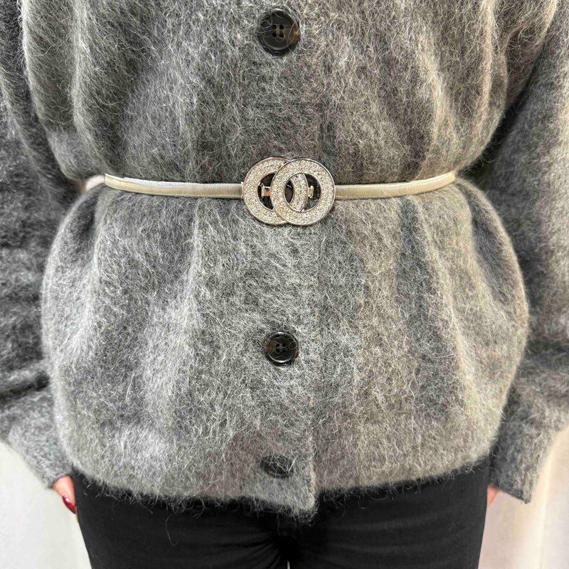Ge din outfit en stilfull och modern touch med detta midjebälte i silverfärg, tillverkat i stretchig metall som formar sig bekvämt efter kroppen. Bältet knäpps framtill och pryds av ett elegant spänne i mitten med två cirklar dekorerade med stenar, vilket skapar en exklusiv och iögonfallande detalj.